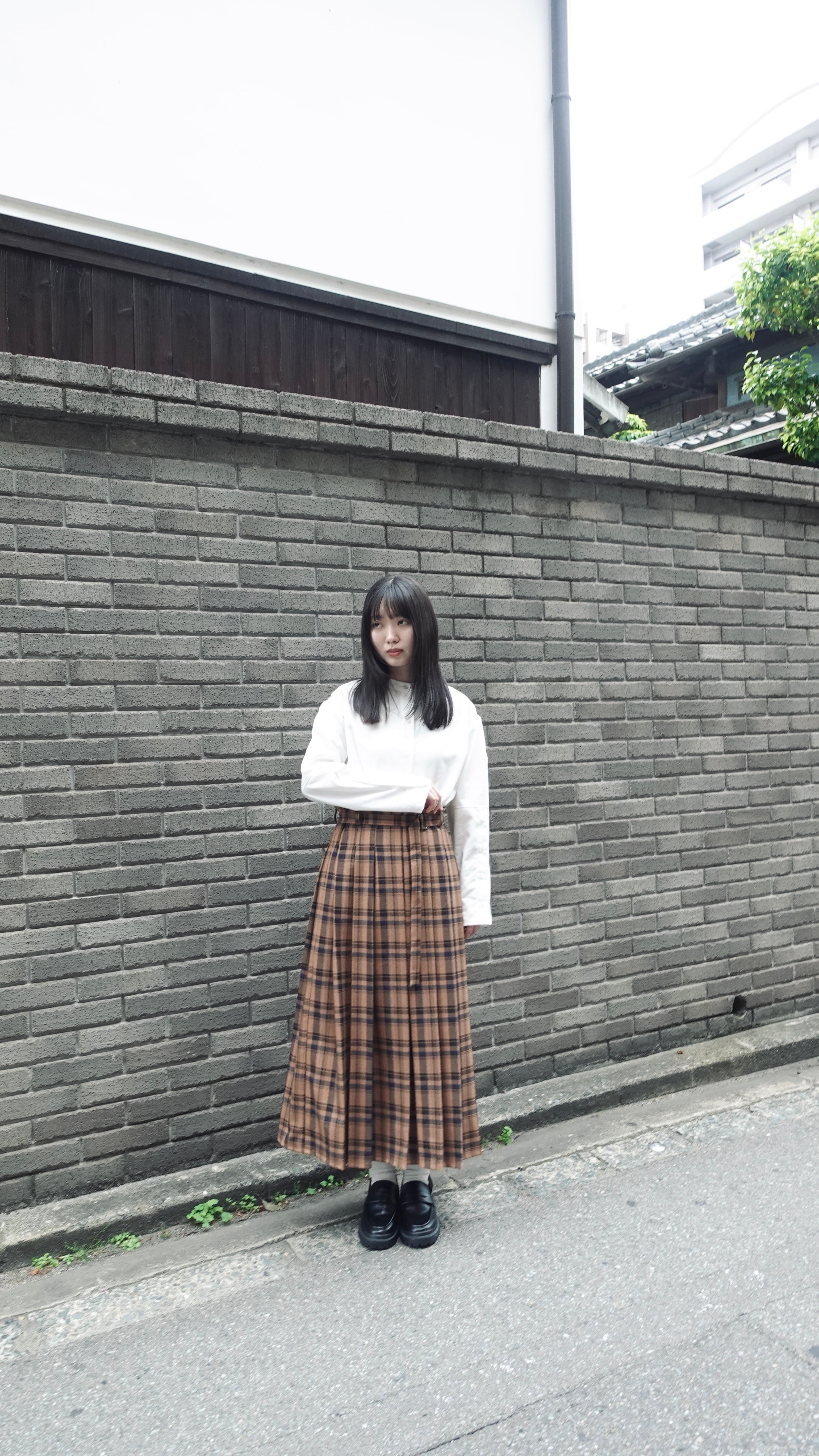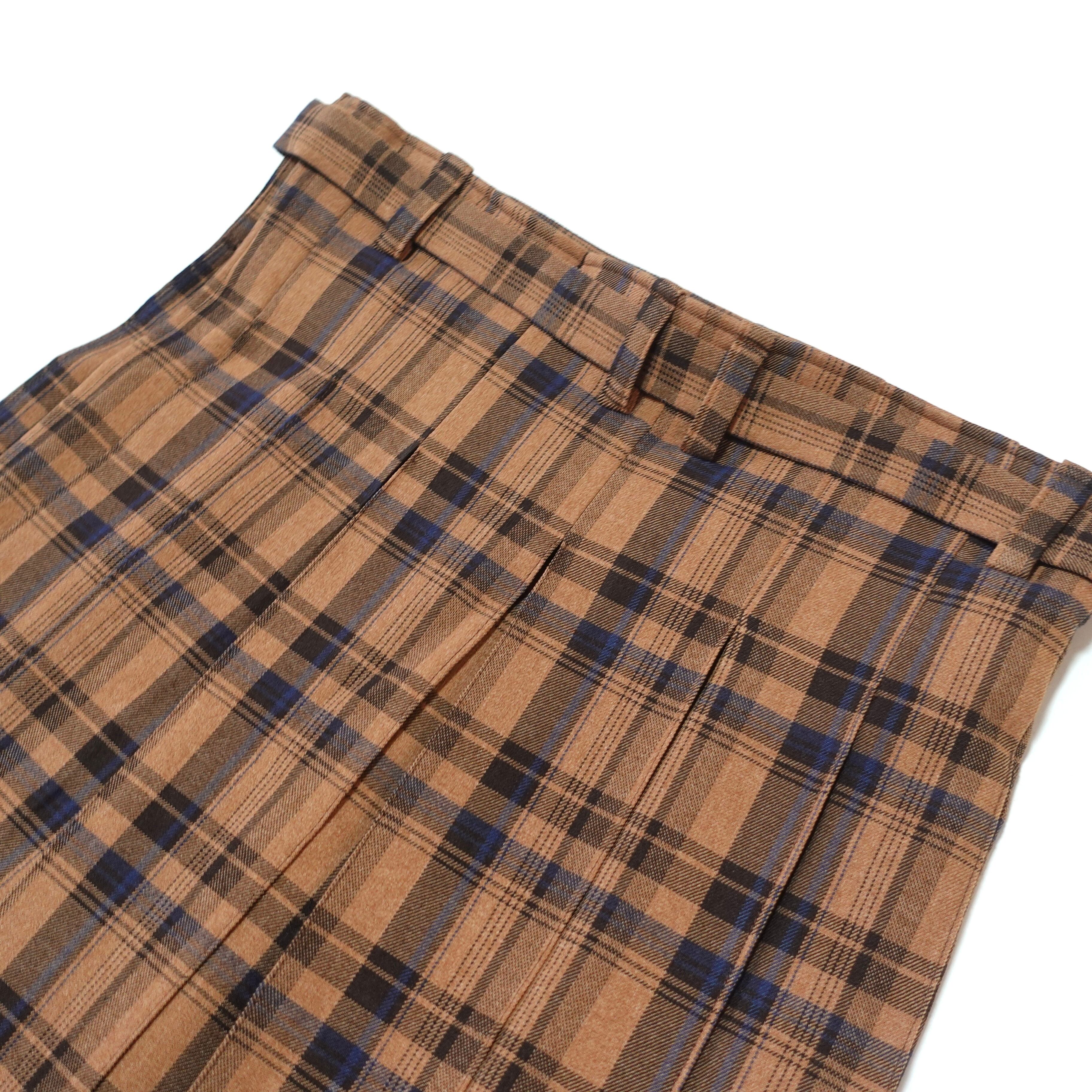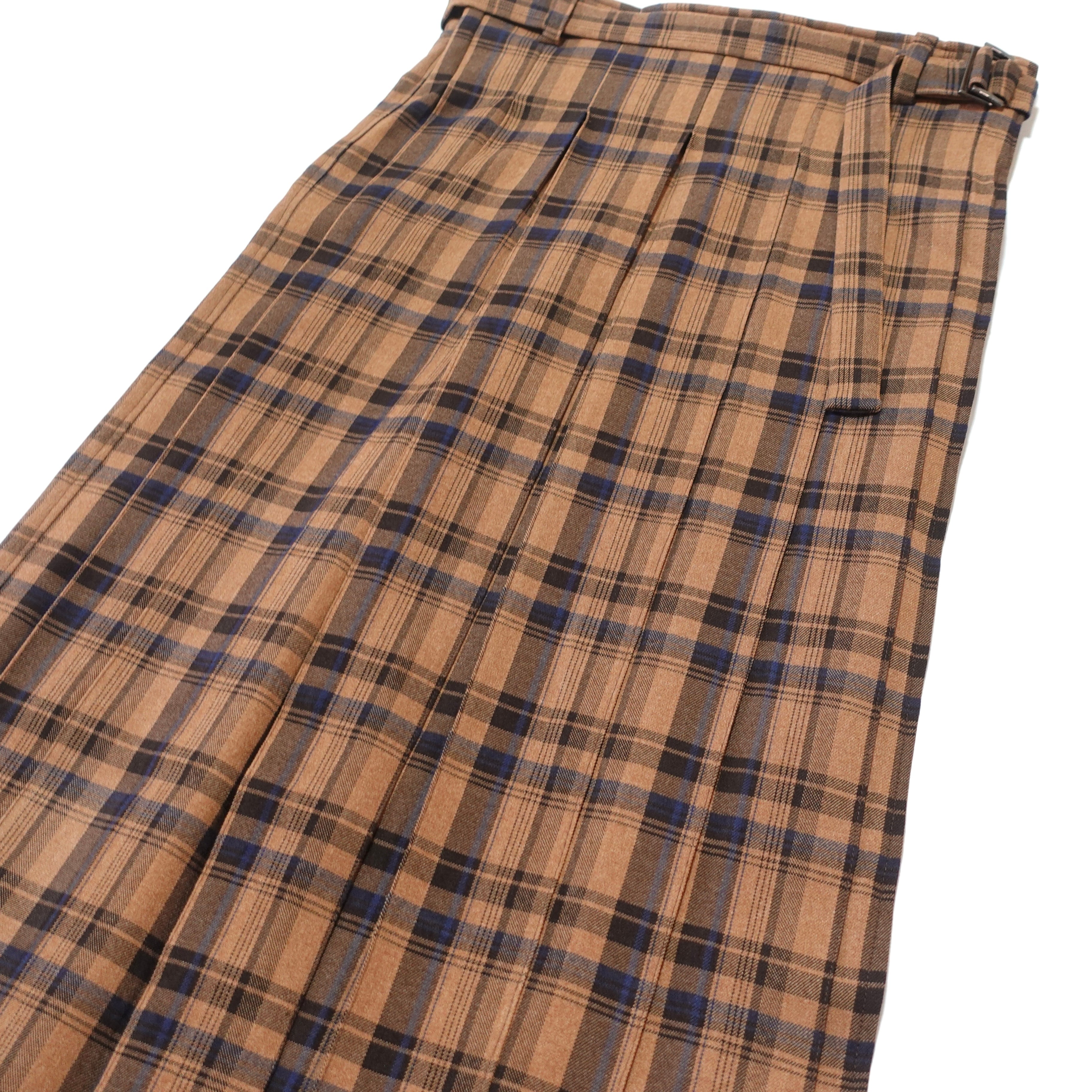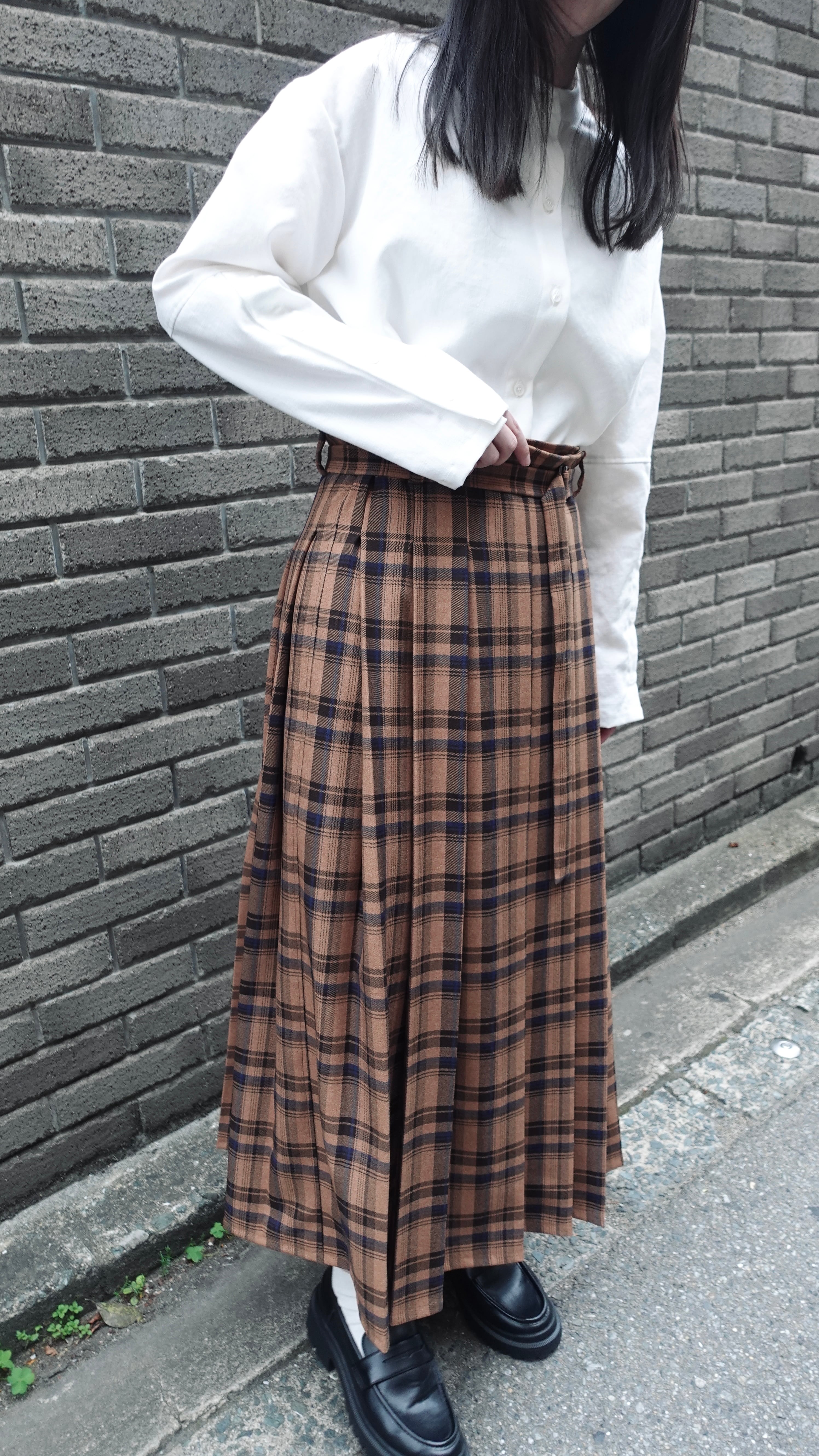 3 色の糸を巧みに配列し多色感を出したチェック柄のプリーツ巻きスカート