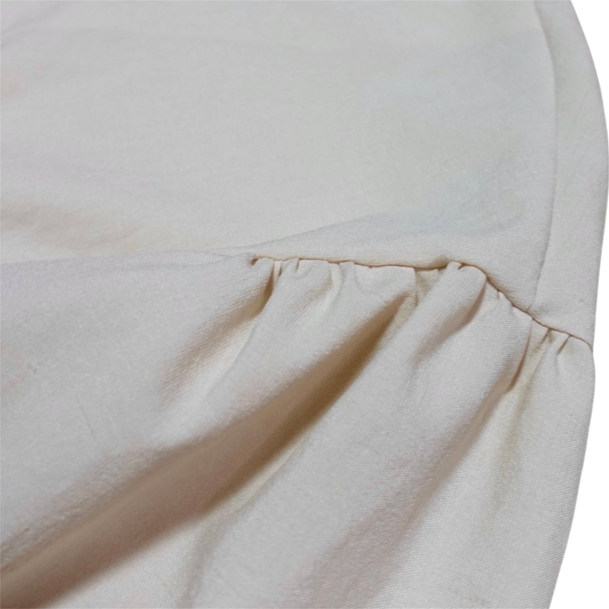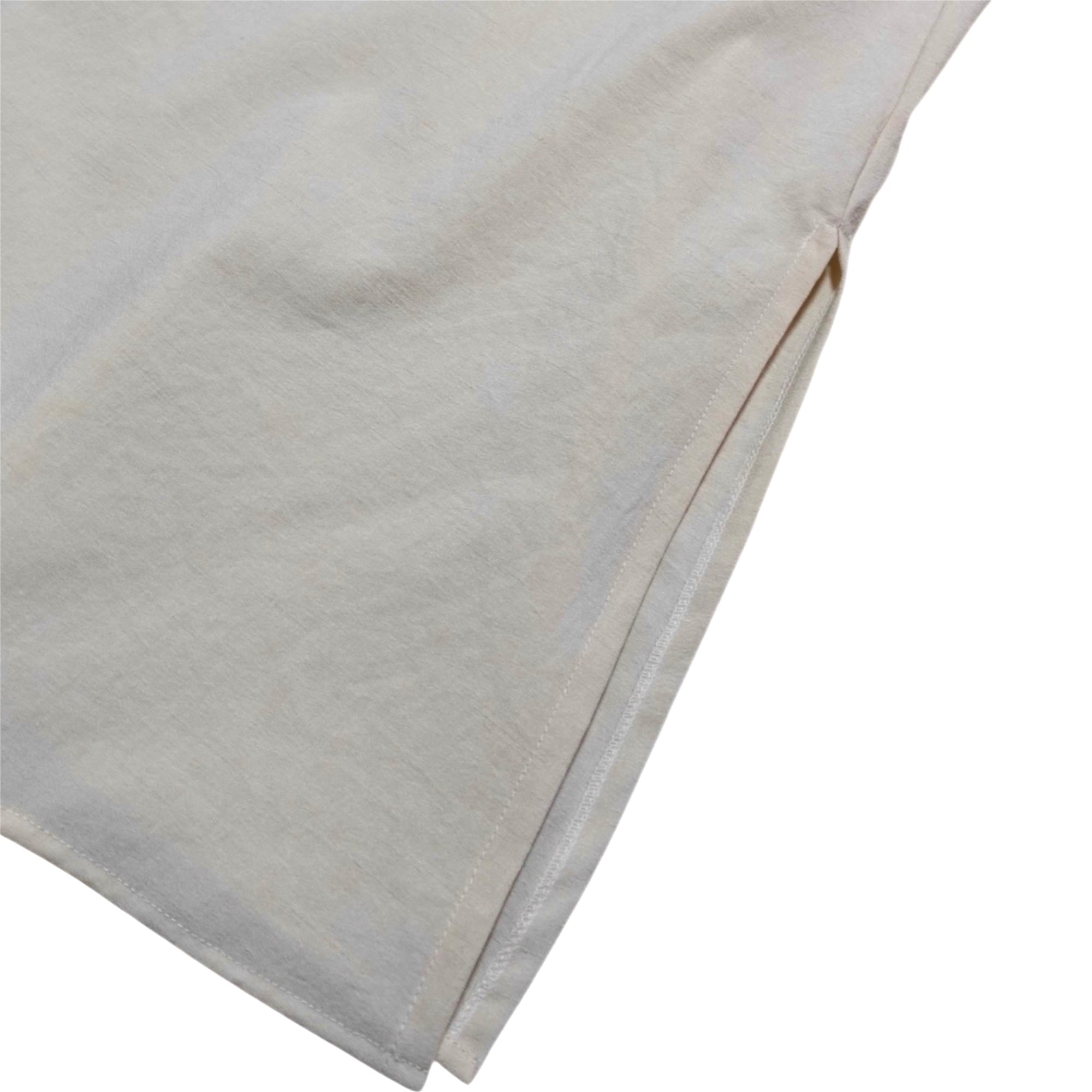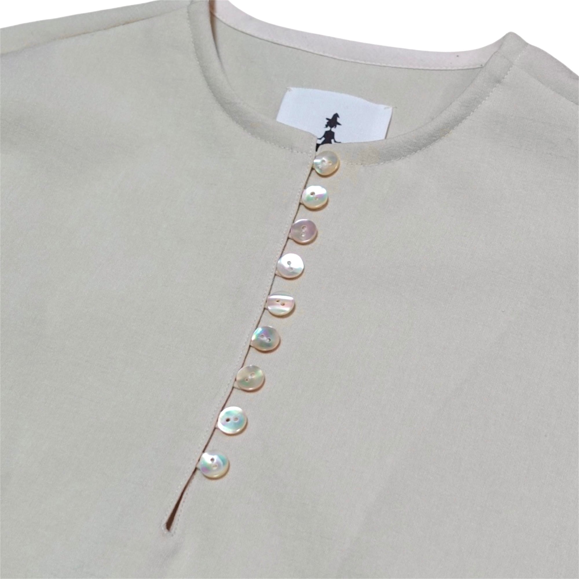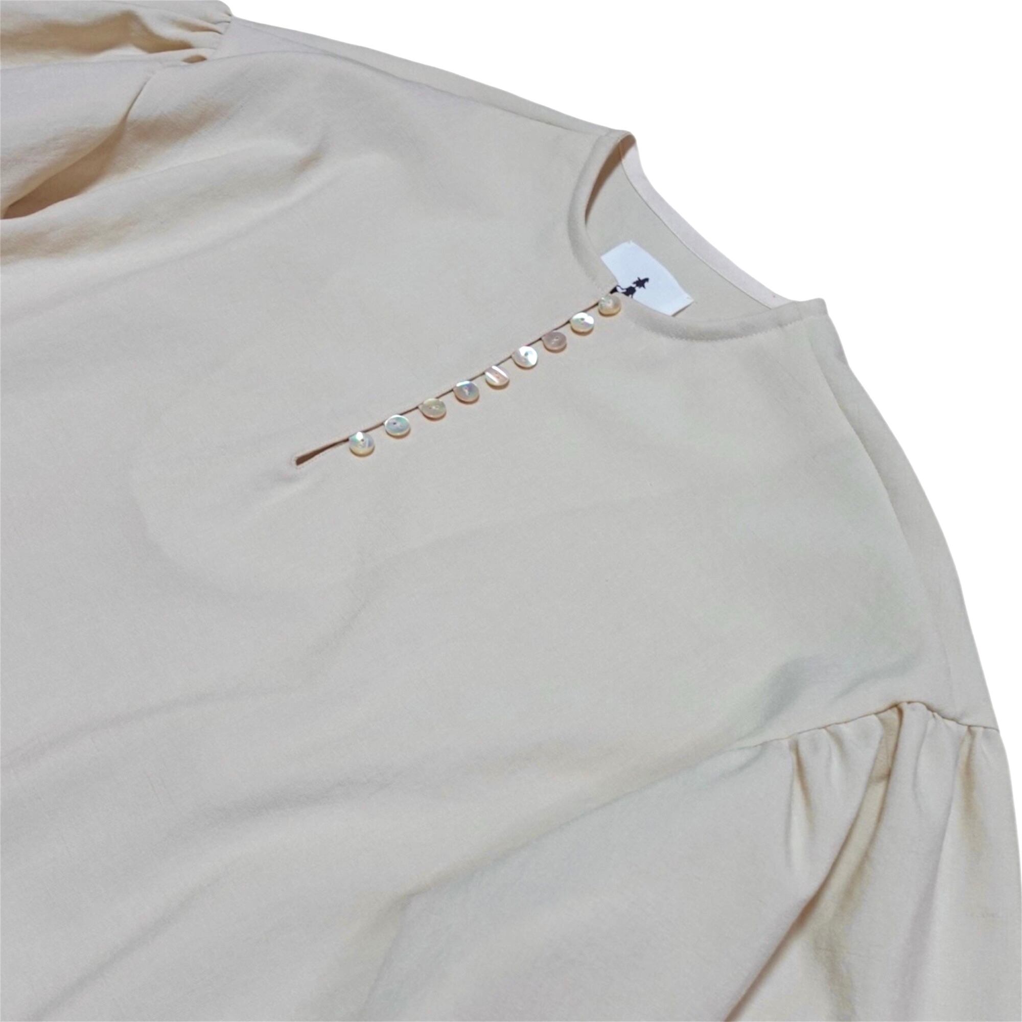 連鎖した貝ボタンもアクセント。シワになりにくいのでイージーケア。お色はクリーンな印象のアイボリーカラーです。