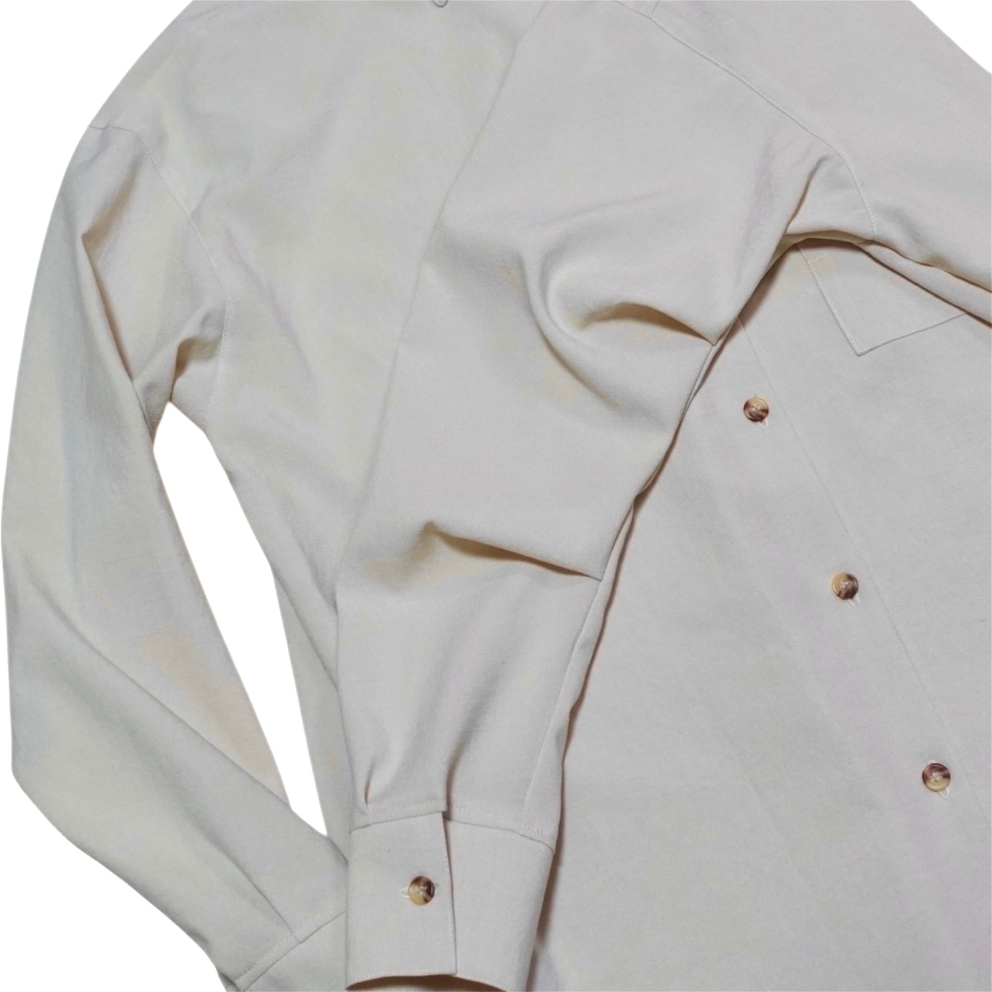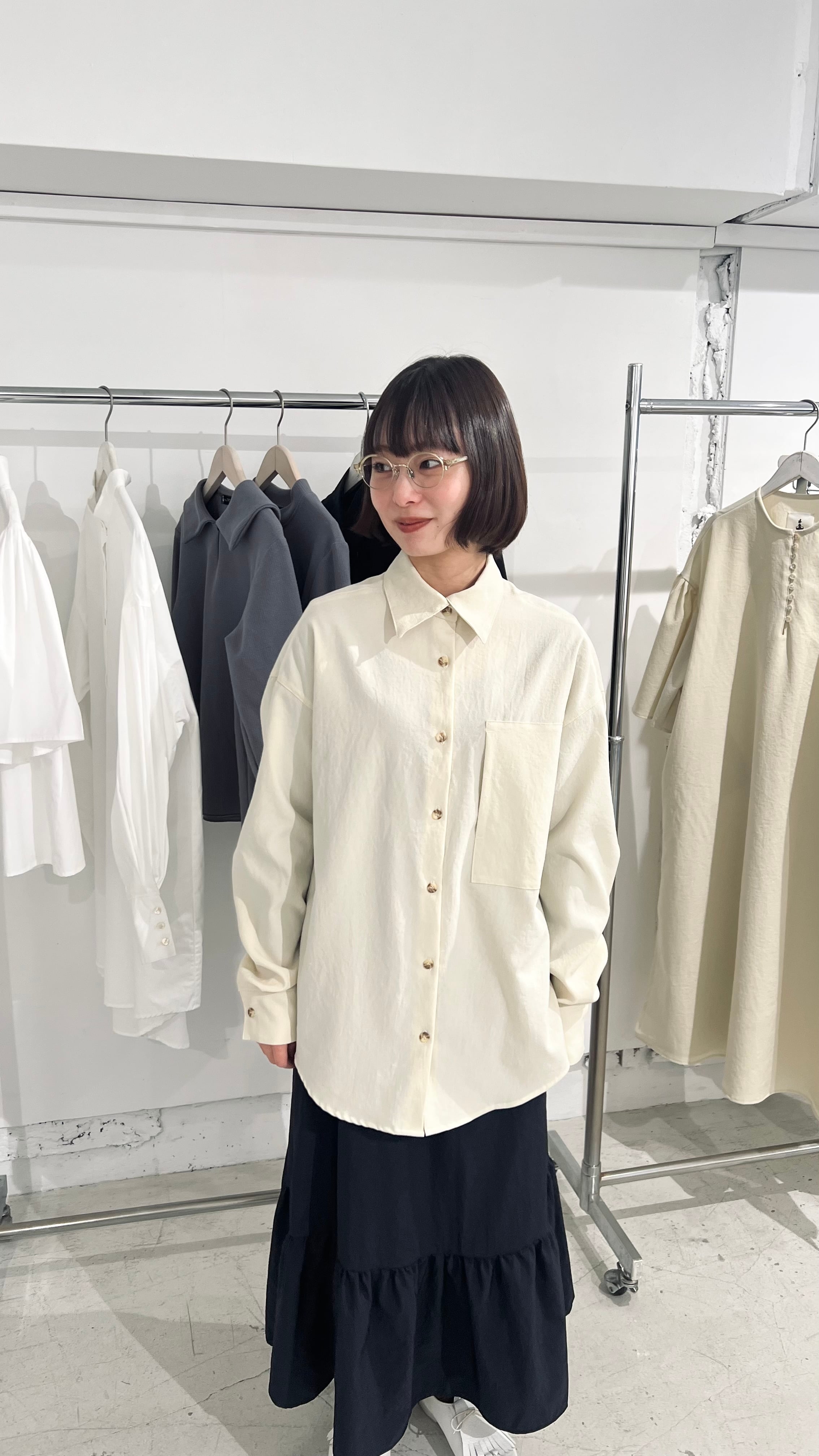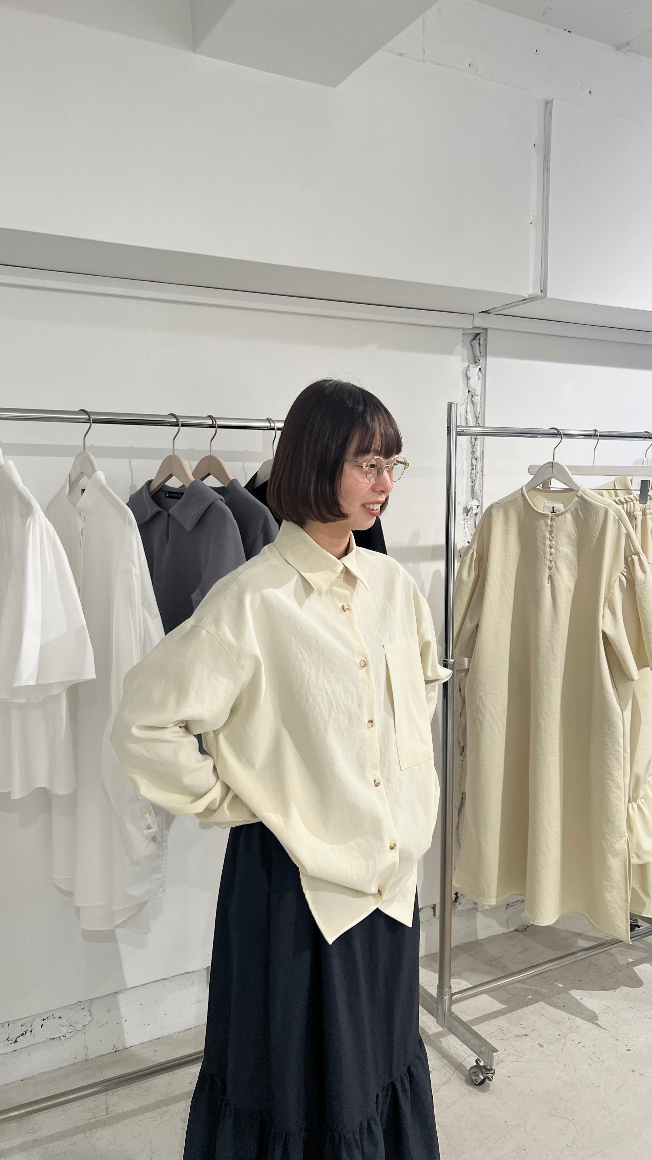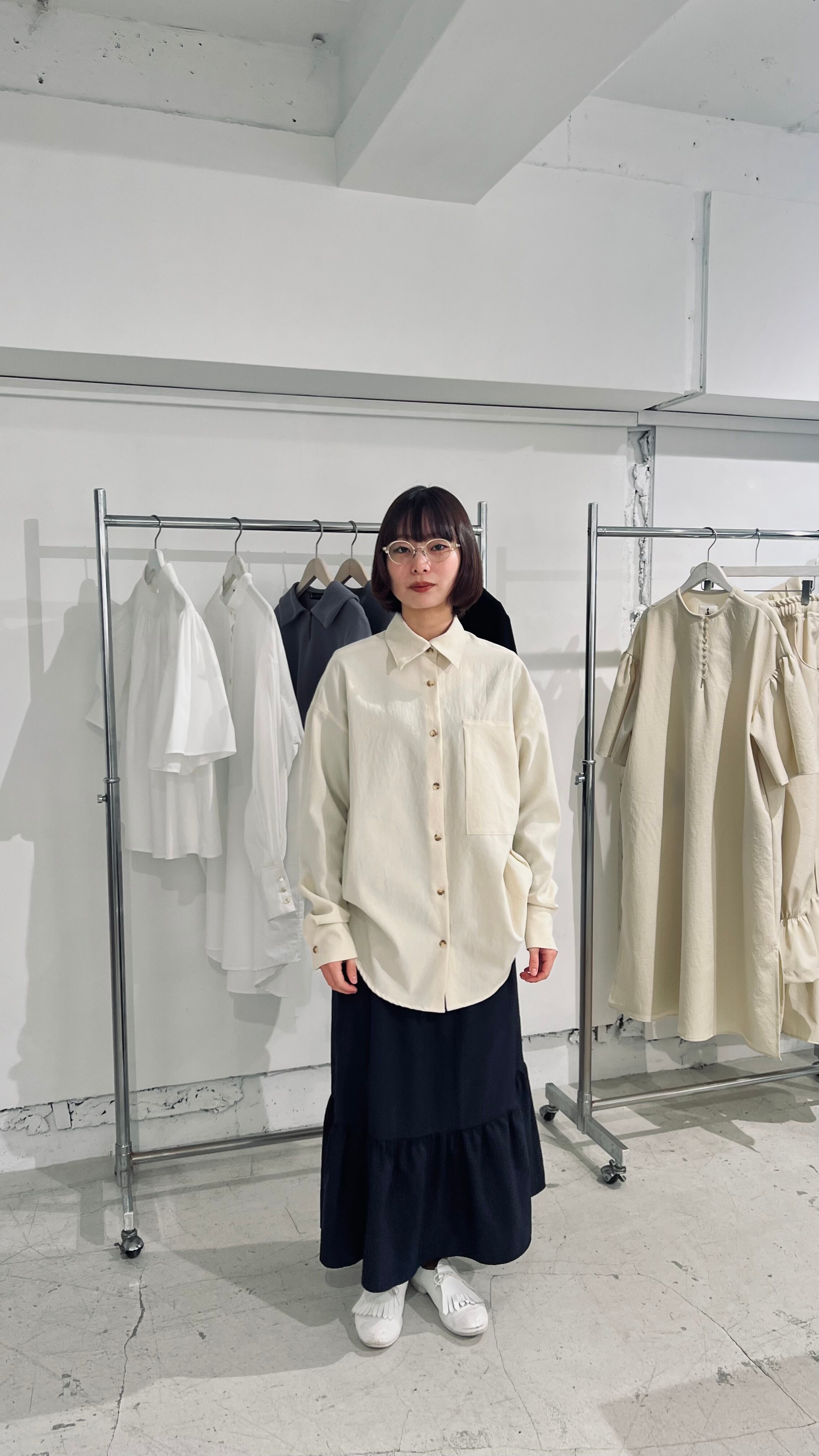 シンプルでオフィスカジュアルにも向いているのに個性的な一着。お色はクリーンなアイボリー色。着用写真のお色味が近いです。