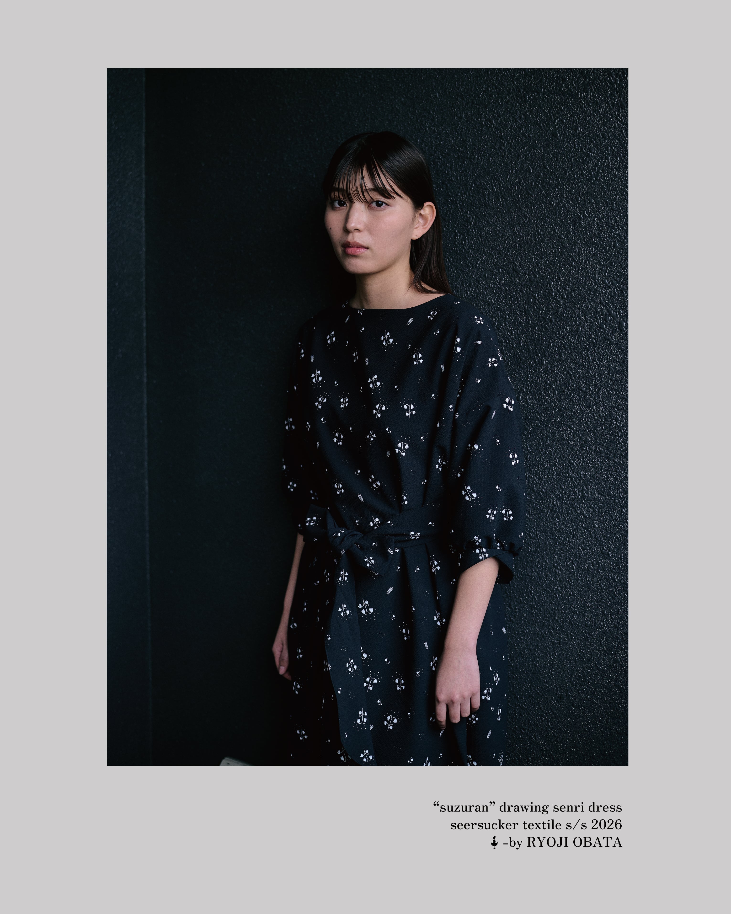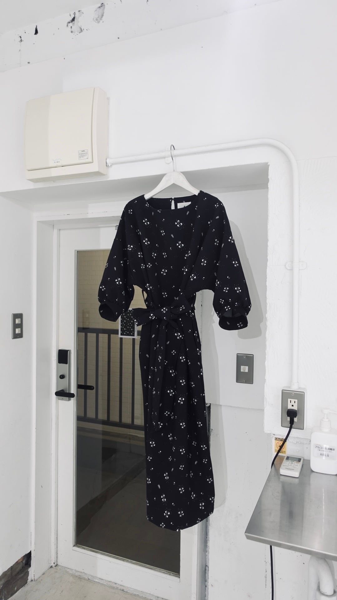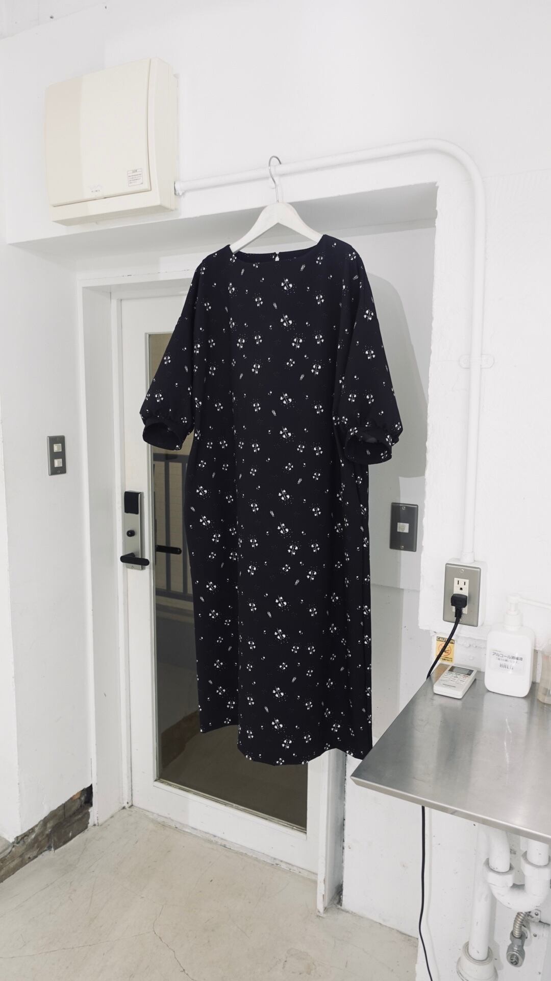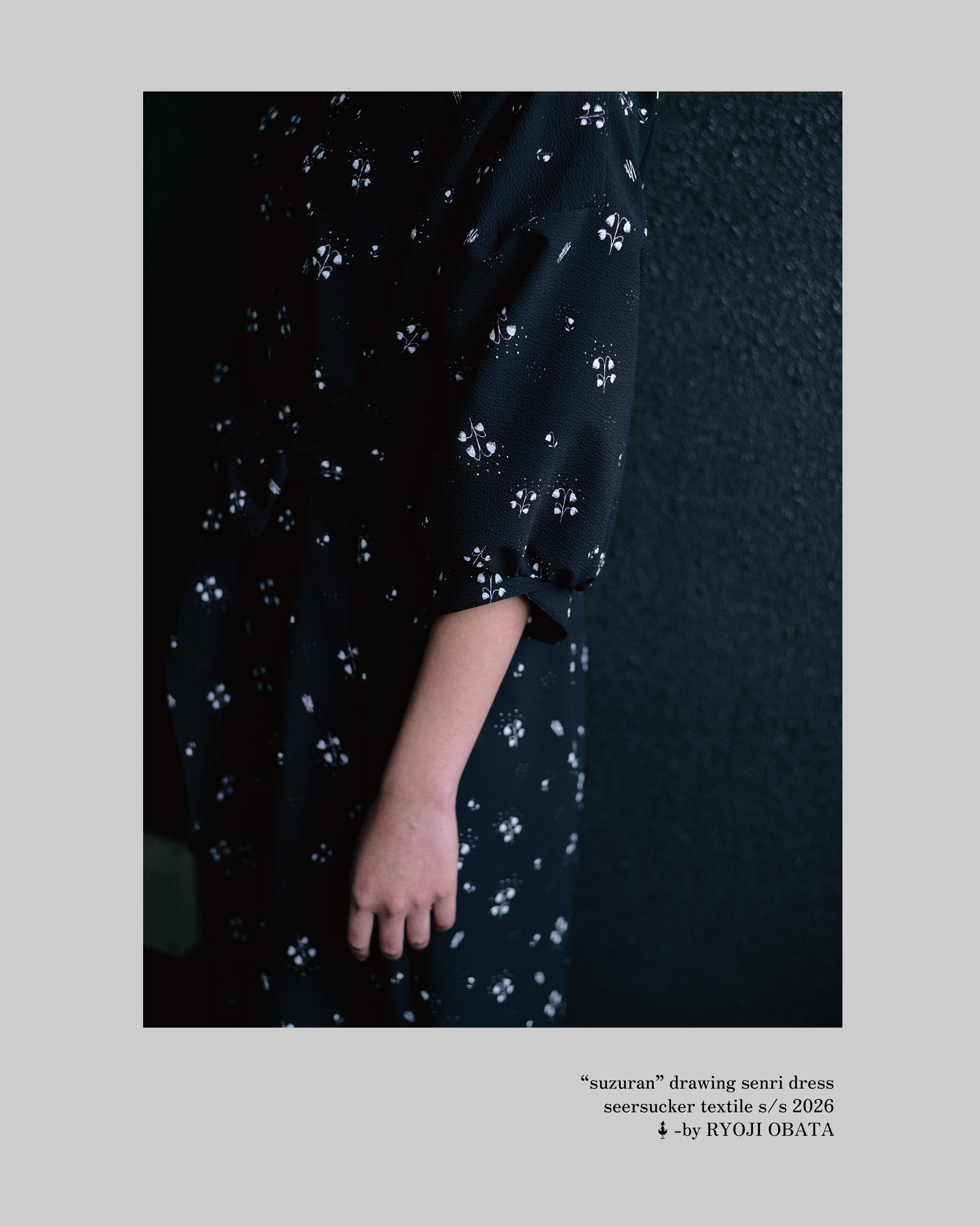 シアサッカー生地に手描きのスズラン柄がプリントされたワンピースドレス。