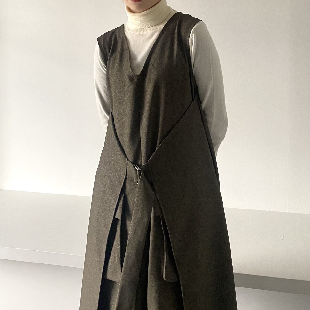 前後で着用でき、両脇に備えたエプロンで印象を変化出来るノースリーブワンピース。 フロントにはマチ付きのBigサイズポケットを採用。 サイドに切替えたエプロンを前後に通したりすることで5通りの着用が可能。 そのままお洗濯できることもメリット。